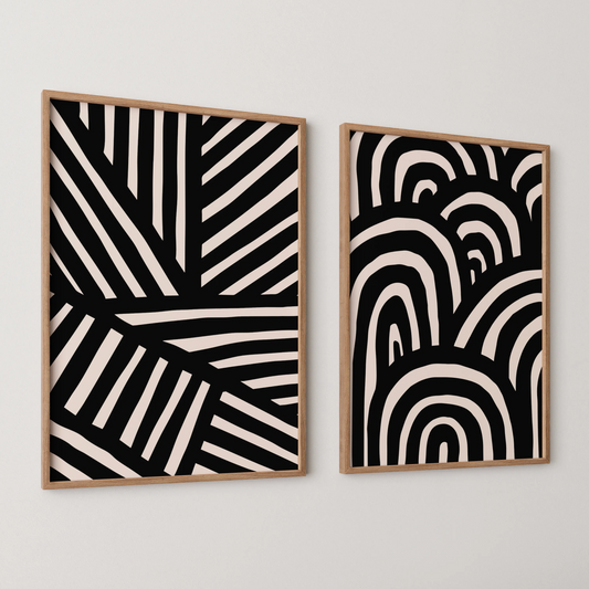 Abstract Lines & Patterns, Set of 2, Black & White Mid Century Aesthetic Wall Art