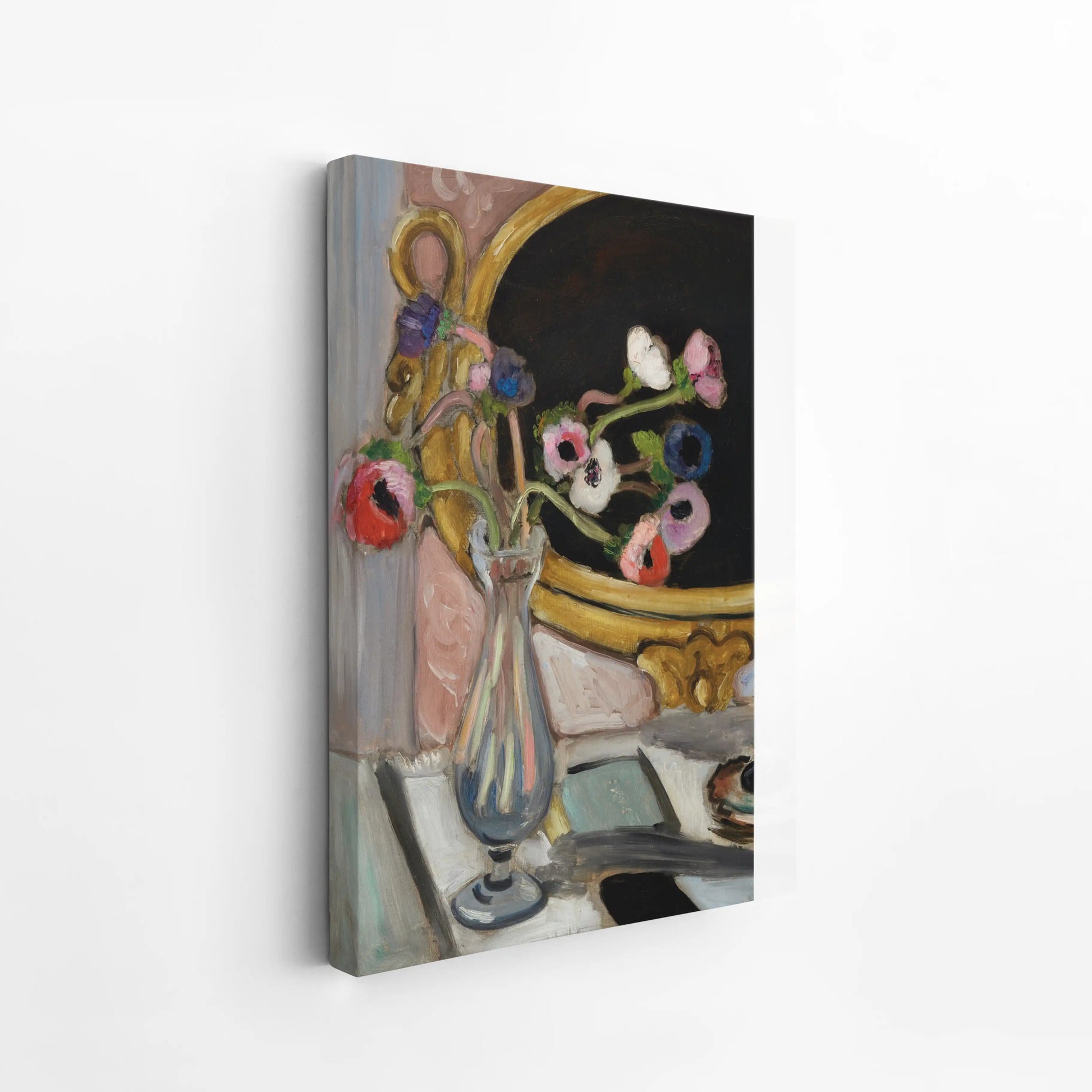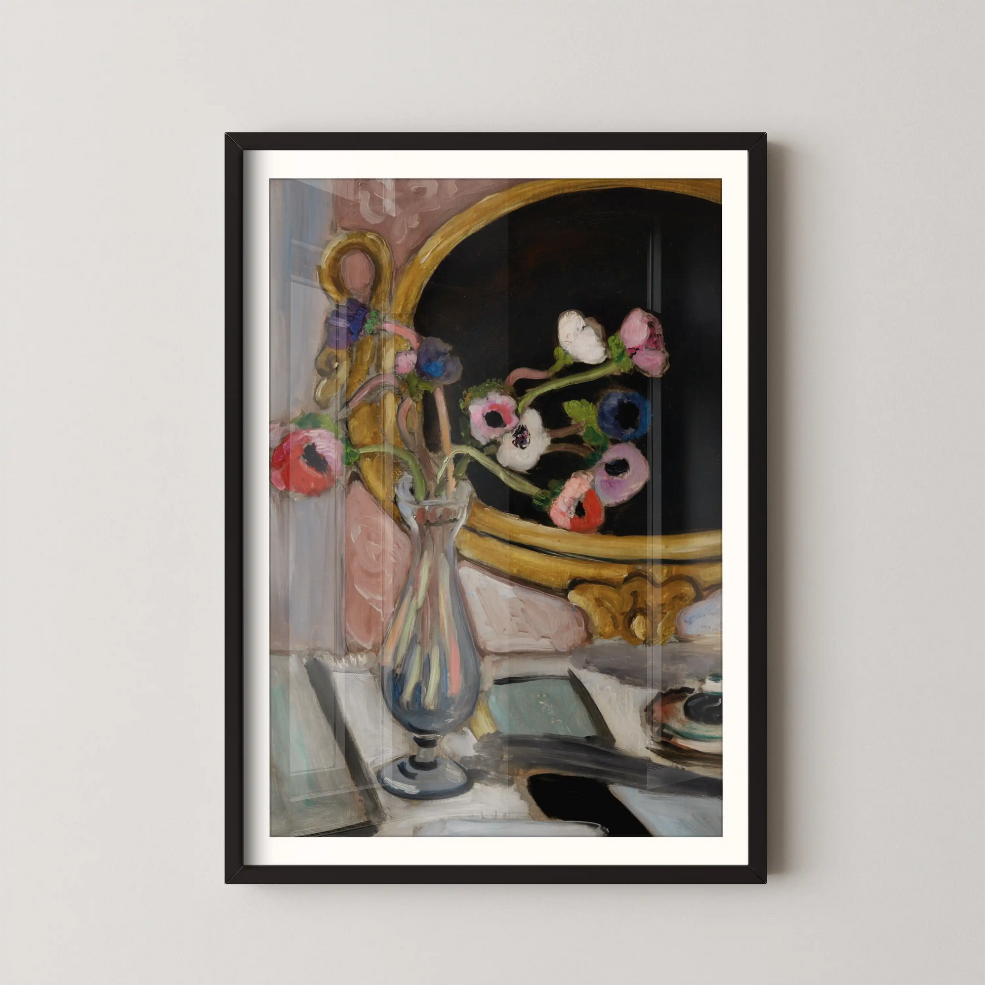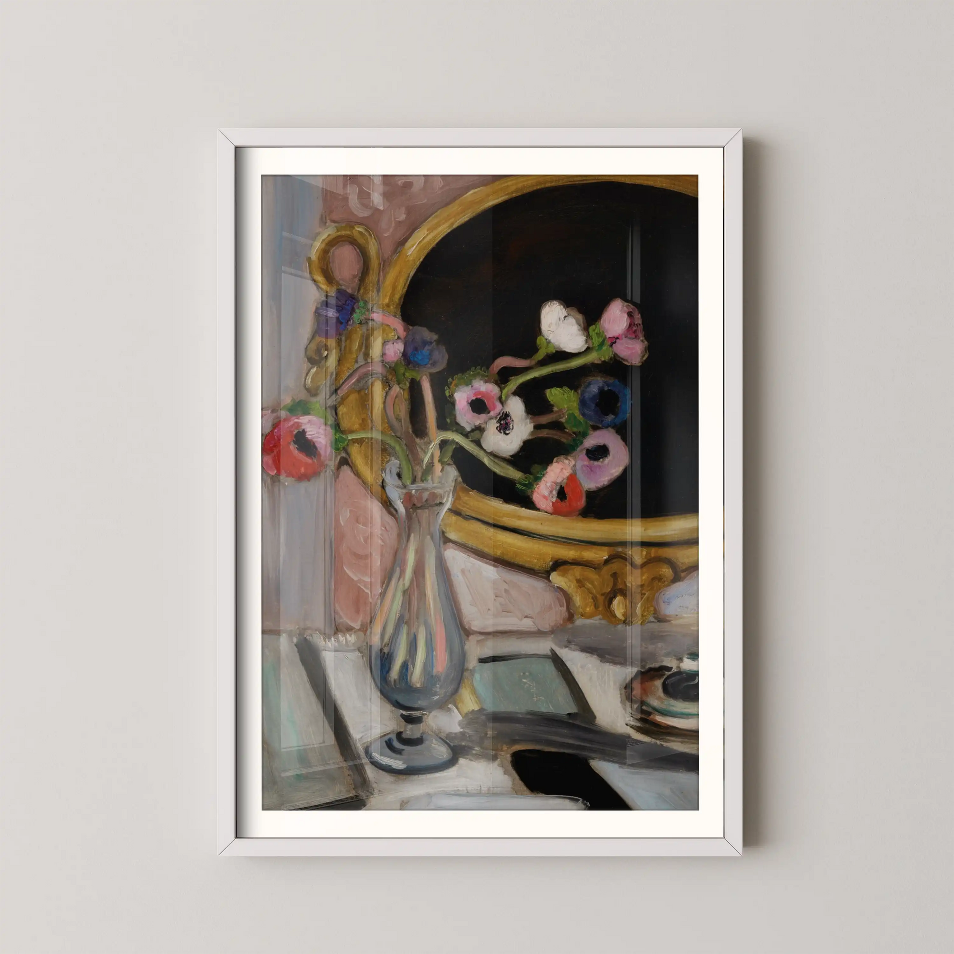 A vase of wild blooms leans toward its own reflection in a golden mirror. The colors—soft yet vibrant—dance across the canvas, evoking freshness and quiet wonder. It’s a portrait of flowers not as decoration, but as living poetry.