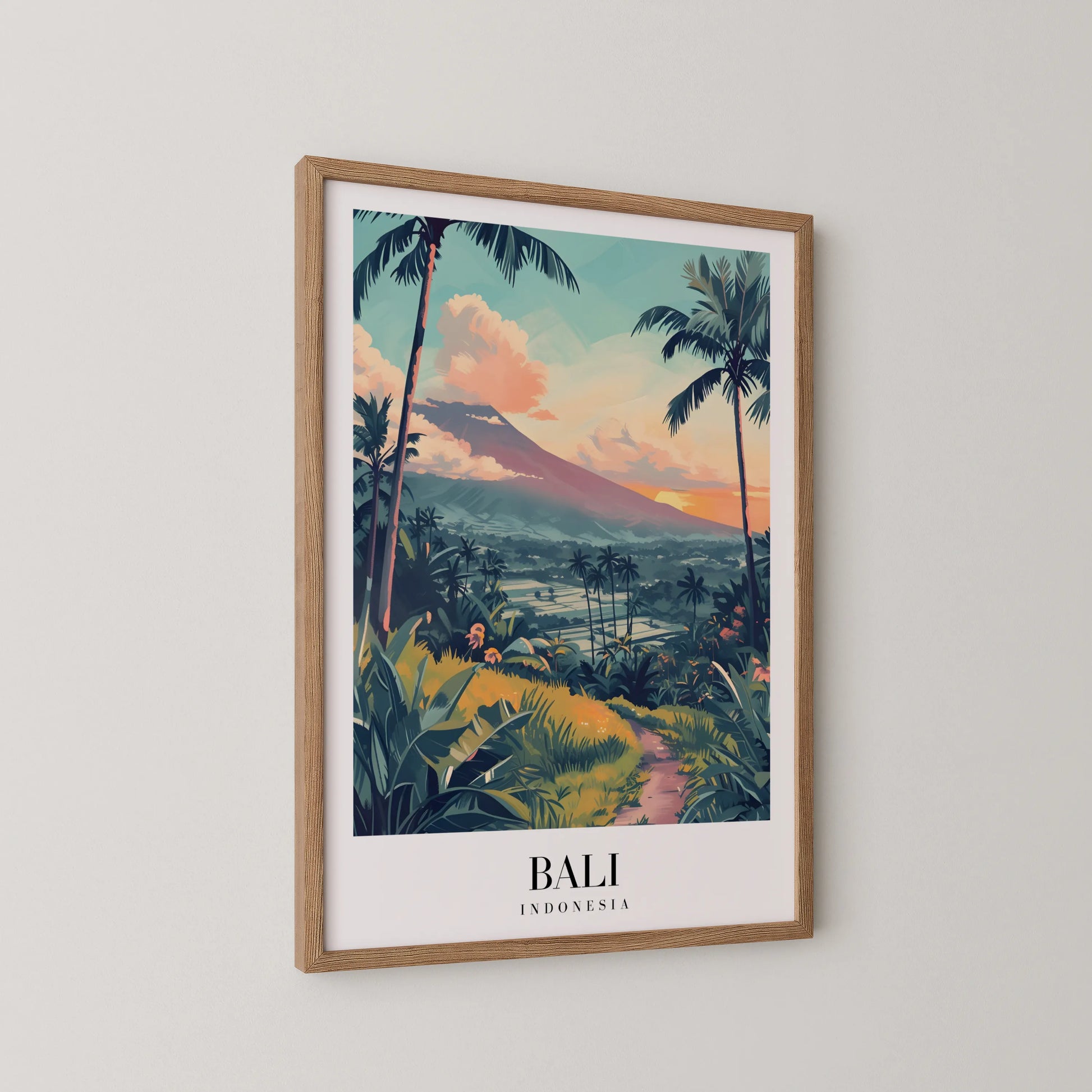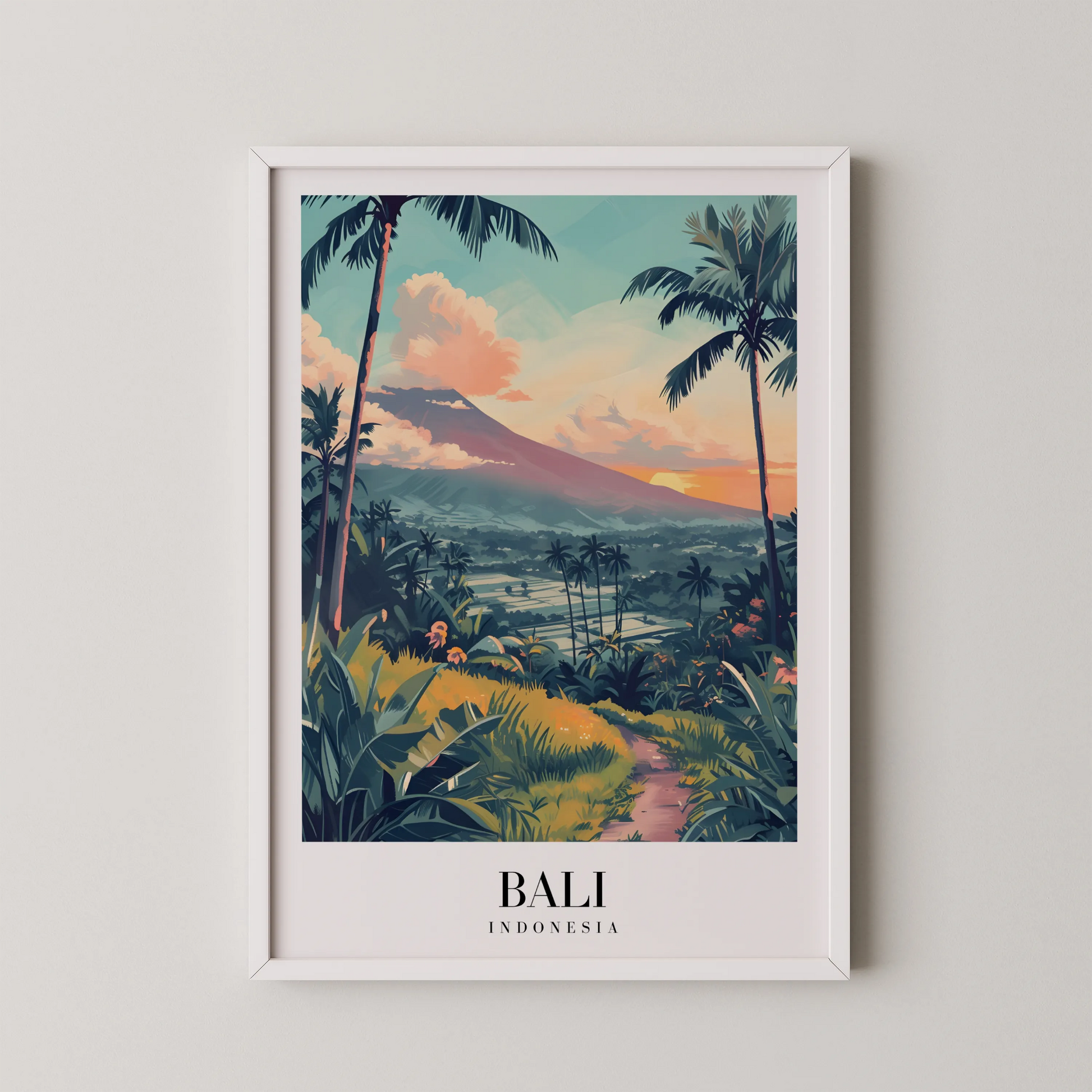 A tropical path winds through lush greenery, leading toward a towering volcano at sunset. Palms sway gently in the warm breeze while skies glow in soft pastel hues. This piece radiates serenity and wanderlust, inviting you to escape into paradise.