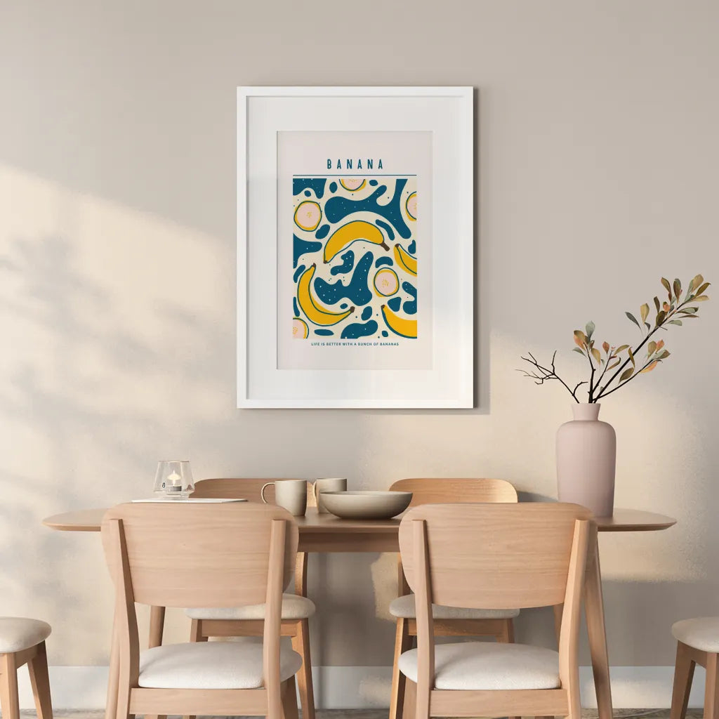 Brighten your walls with a playful, colorful twist on a beloved fruit. This banana print is full of cheerful energy, with bold yellow curves and vibrant blue hues that instantly bring a smile. The quirky design, paired with the fun phrase, "Life is better with a bunch of bananas," adds a touch of joy and lightheartedness to your kitchen, dining room, or any space in need of a pop of color.