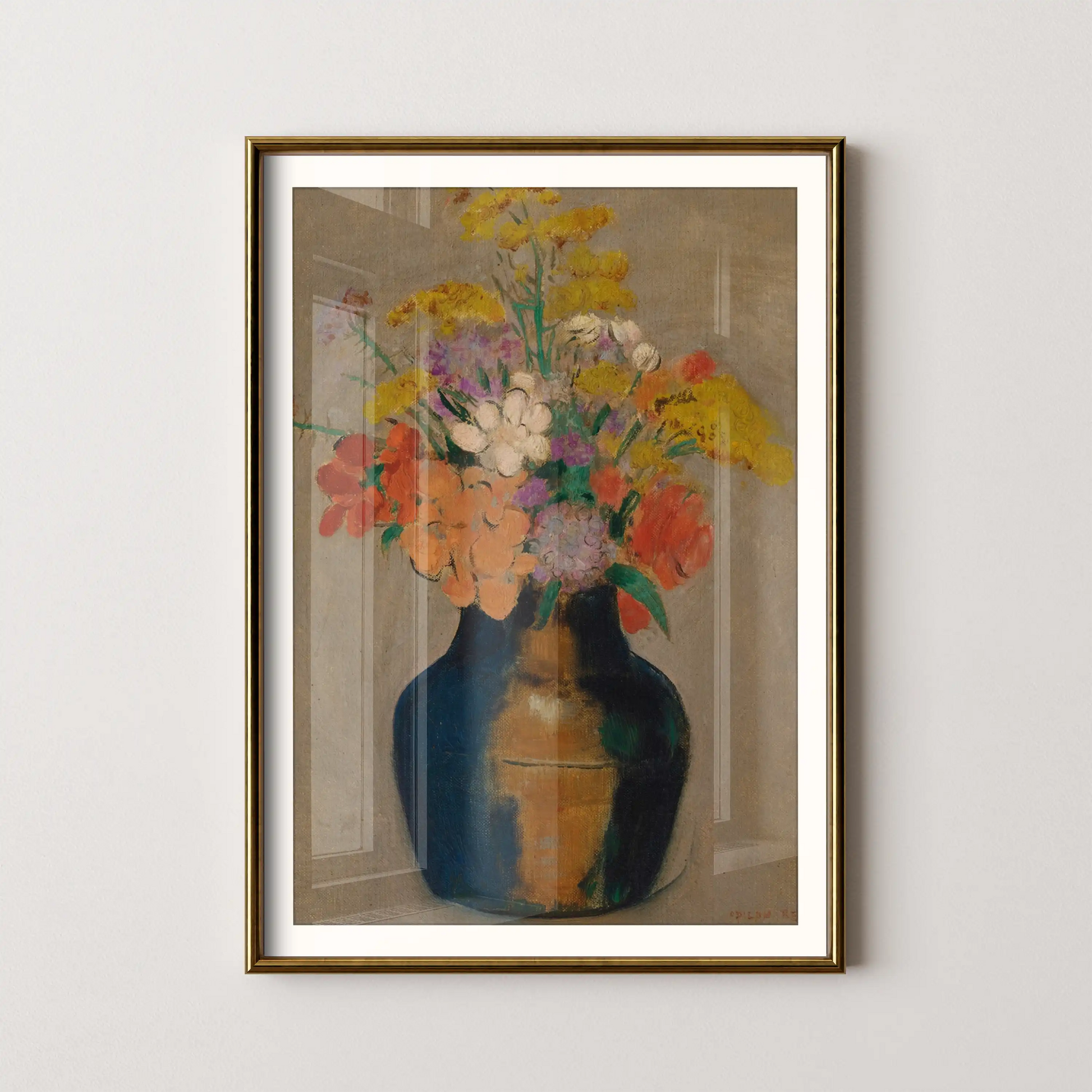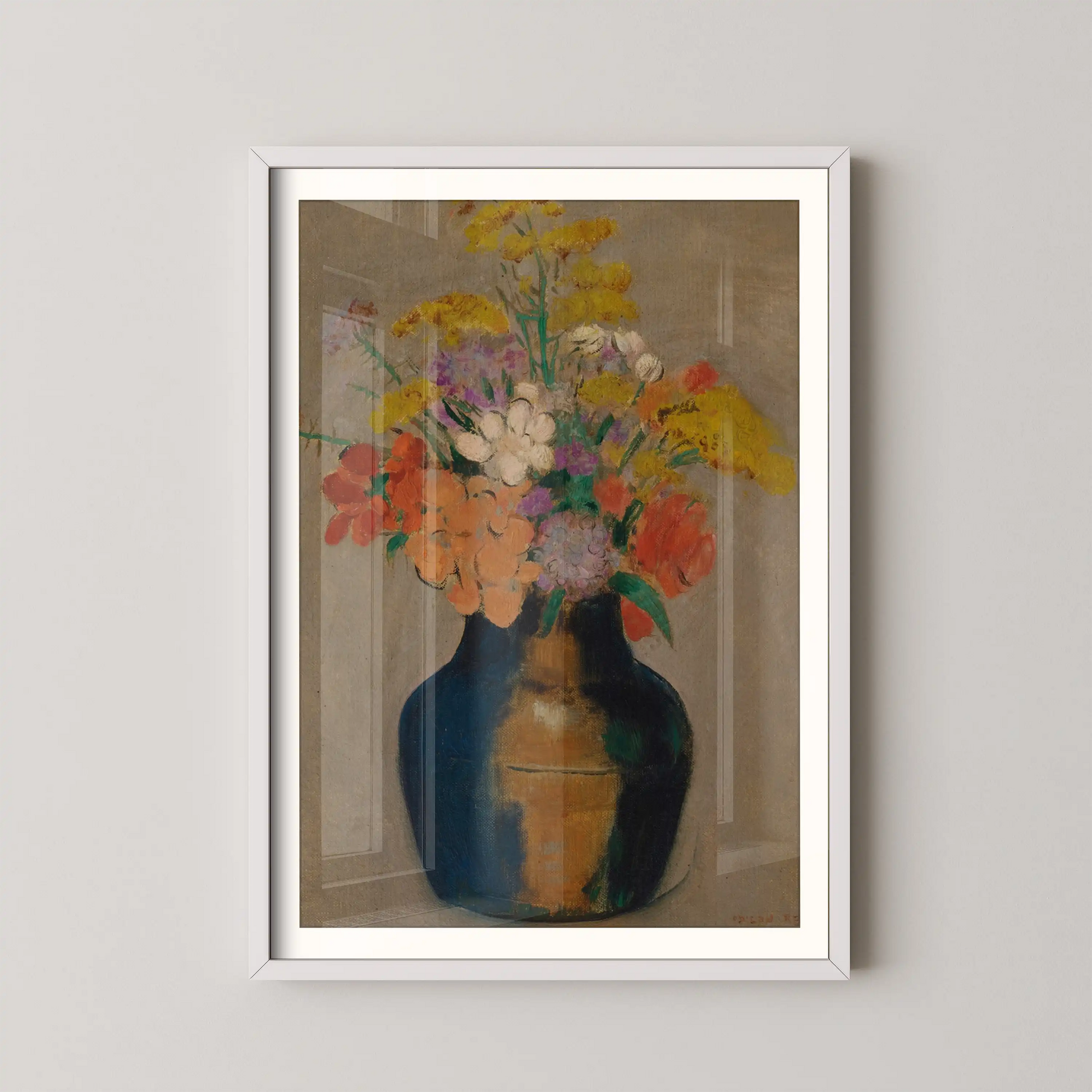 A luminous floral composition filled with warm yellows, coral reds, and soft violets, arranged in a two-toned blue and ochre vase. With its painterly softness and balanced tones, this work captures the timeless beauty of flowers in bloom.