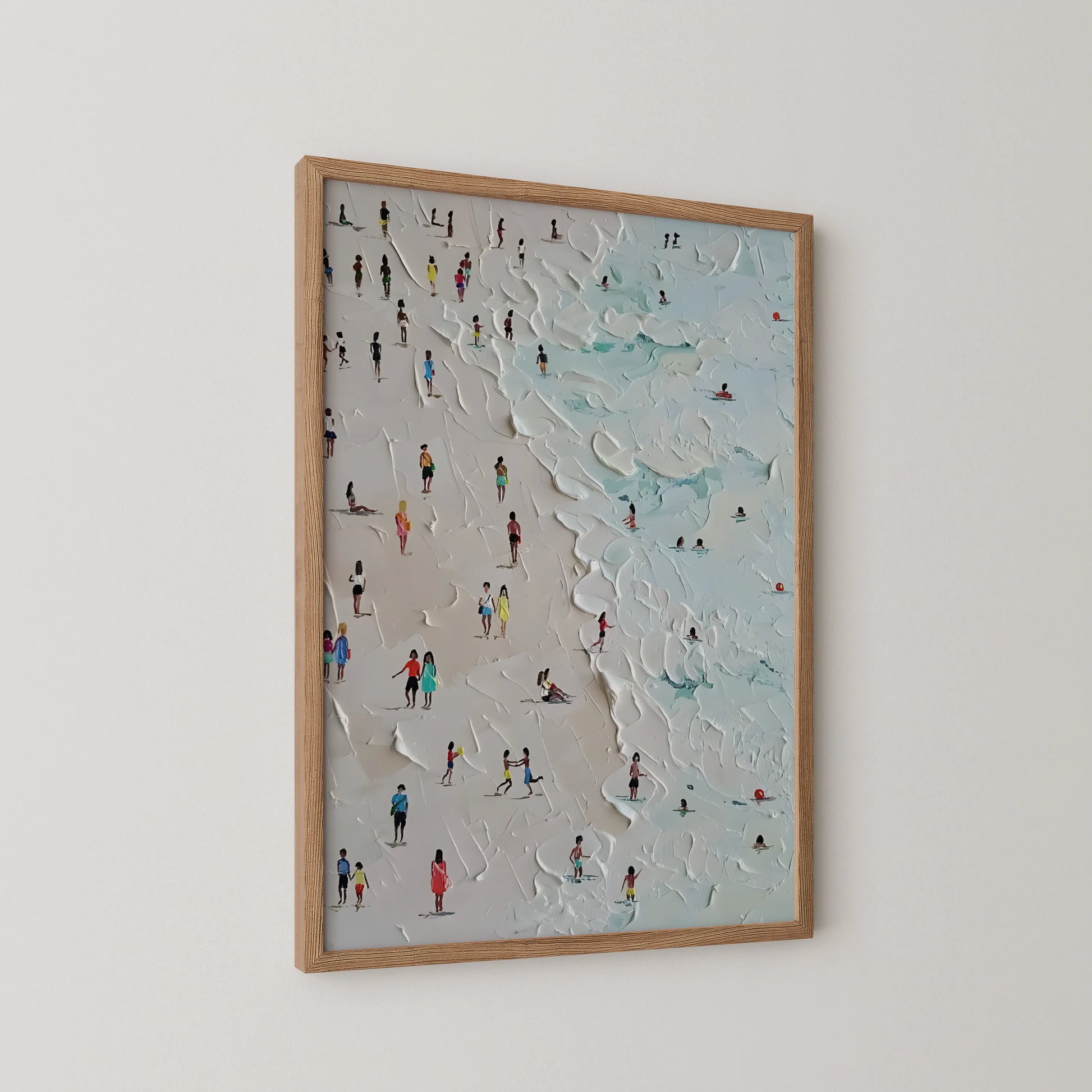 Add the energy of summer to your walls with this lively beach scene artwork. Featuring textured brushstrokes that mimic waves meeting the shore, this piece is alive with tiny, colorful figures scattered across the sand and water. It’s a celebration of movement, togetherness, and the simple joy of a day at the beach. Printed with archival quality on premium museum-grade paper, it’s a statement of modern minimalism infused with playful detail.