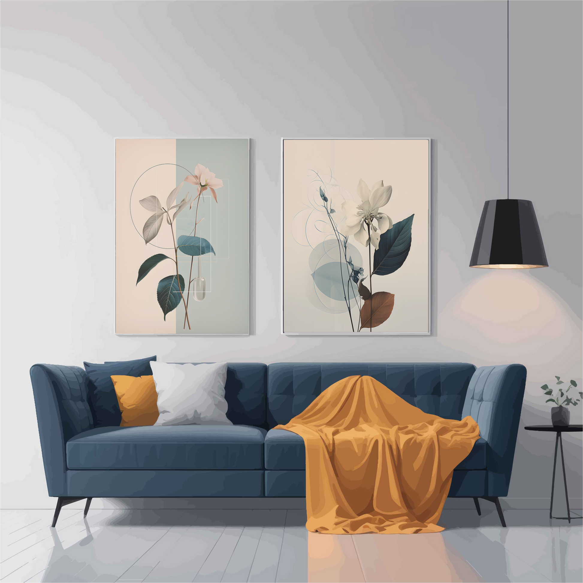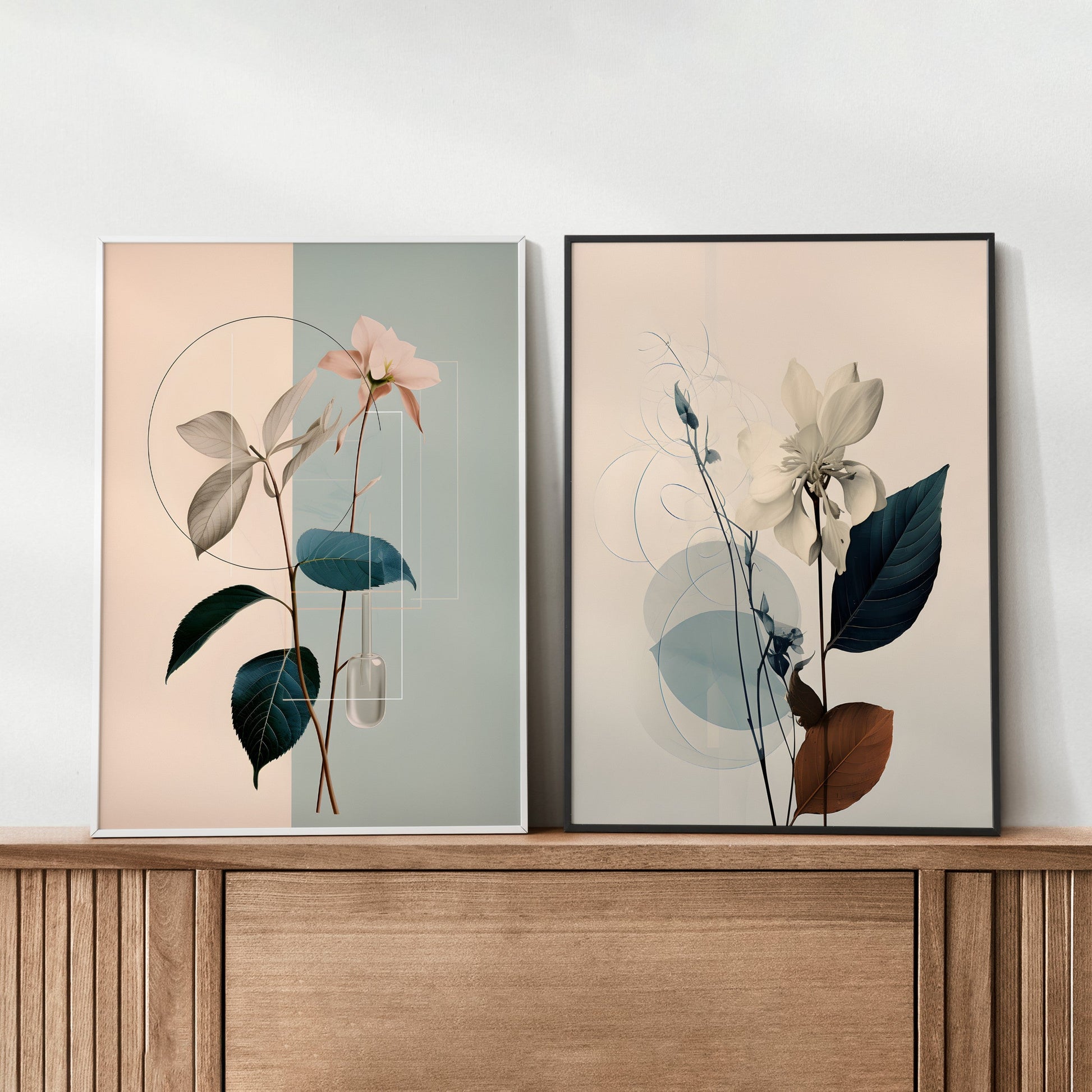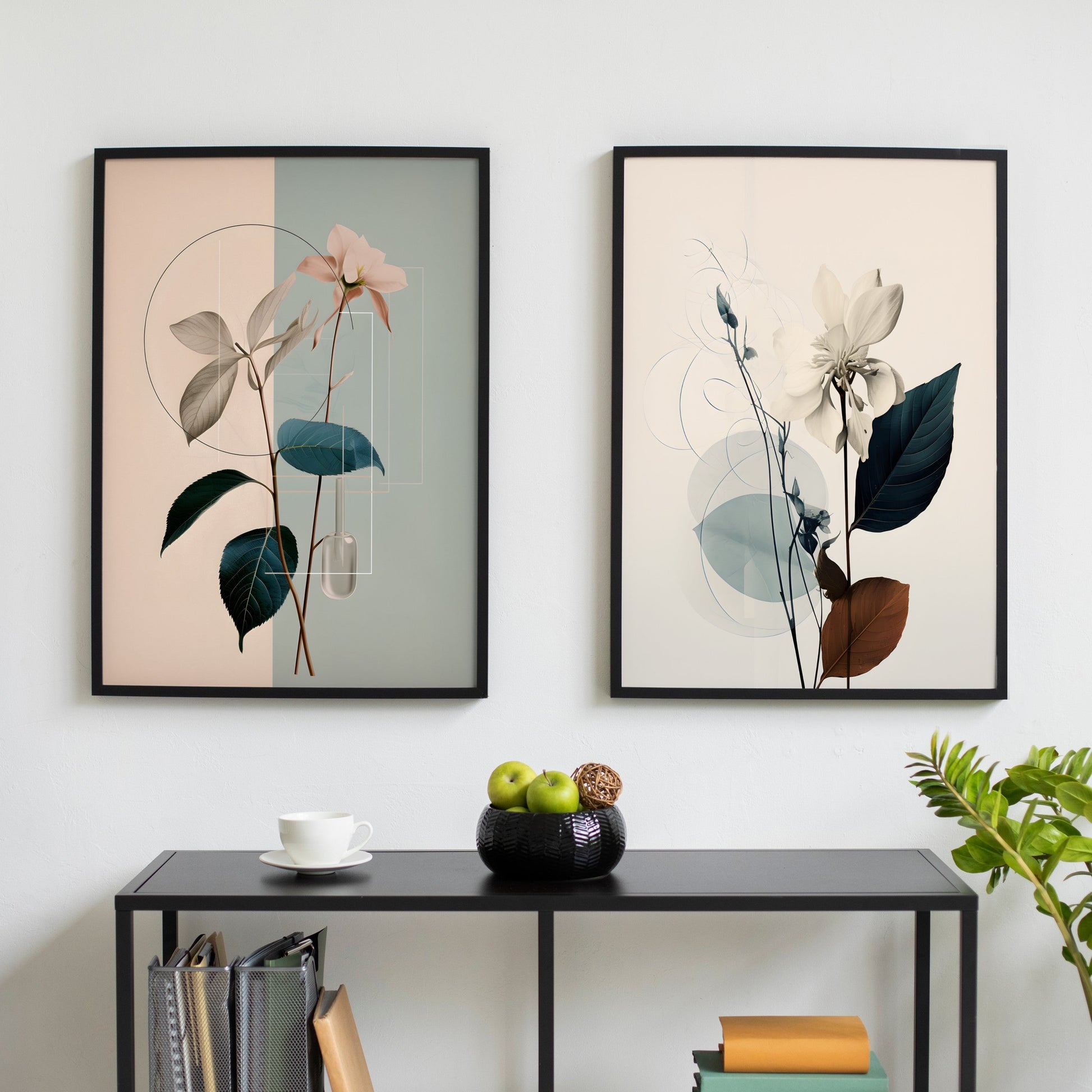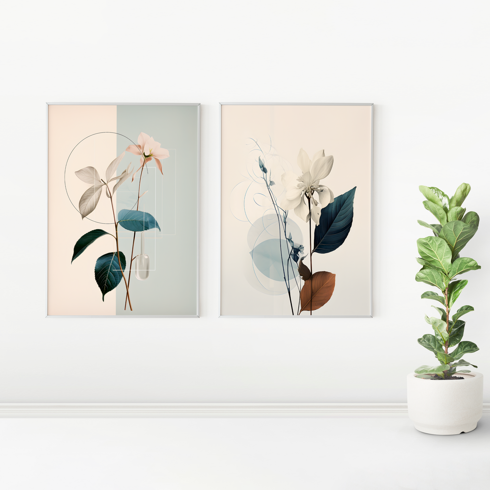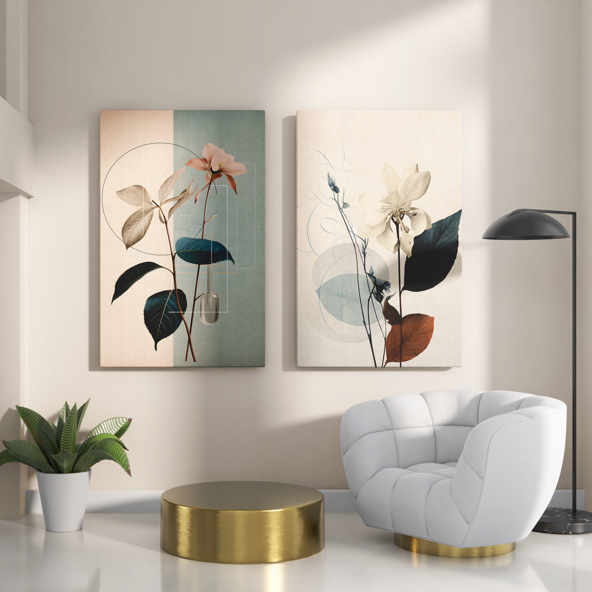 Echoes of Botanical Silence captures the quiet strength and surreal elegance of nature through a paired composition that speaks in hushed tones of form and contrast. The artworks blend structured geometry with fluid organic shapes—soft florals emerging against divided, minimalist backdrops. Muted palettes of blush, slate, and deep green create a visual rhythm that feels both introspective and modern. Together, the two panels form a dialogue of stillness and sophistication, evoking a space where design and nature meet in meditative harmony.
