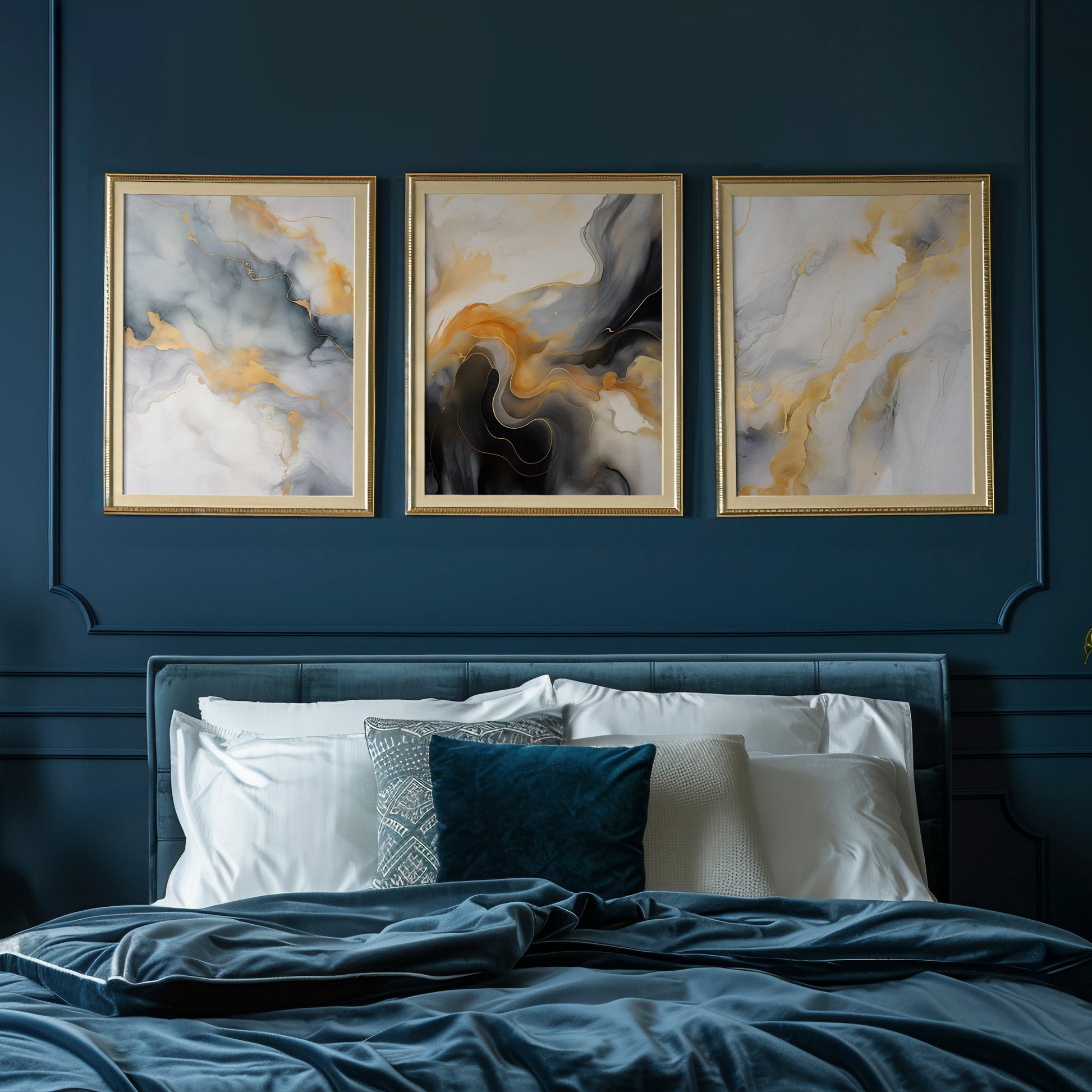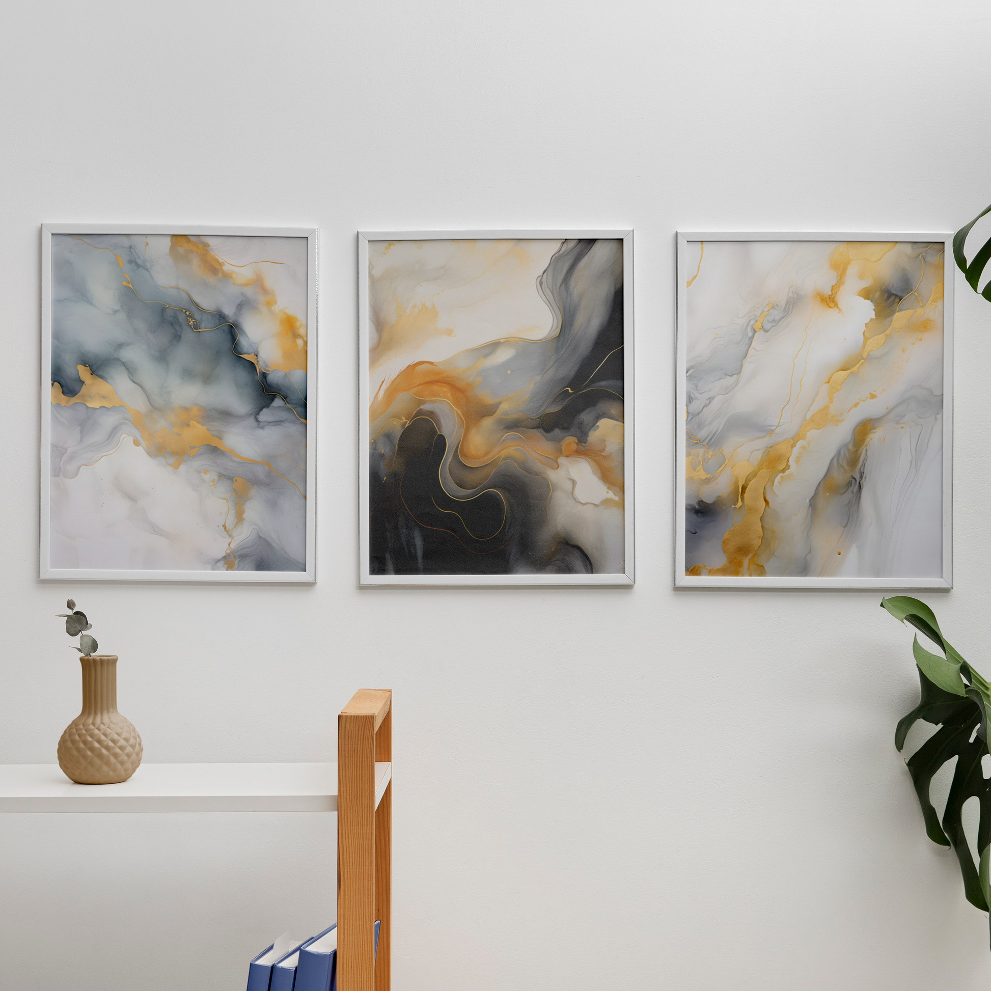 Immerse your space in the quiet luxury of Golden Drift, a 3-panel abstract artwork that flows like molten gold through marbled skies. This modern triptych pairs soft whites, charcoal greys, and fluid gold accents to create an ethereal visual rhythm — designed to transform any room into a refined, contemporary sanctuary. Each panel complements the next, with graceful transitions that mimic the movement of smoke, liquid, and light. Whether styled in a living room, hallway, office, or creative studio, this piece brings depth, warmth, and artistic serenity.