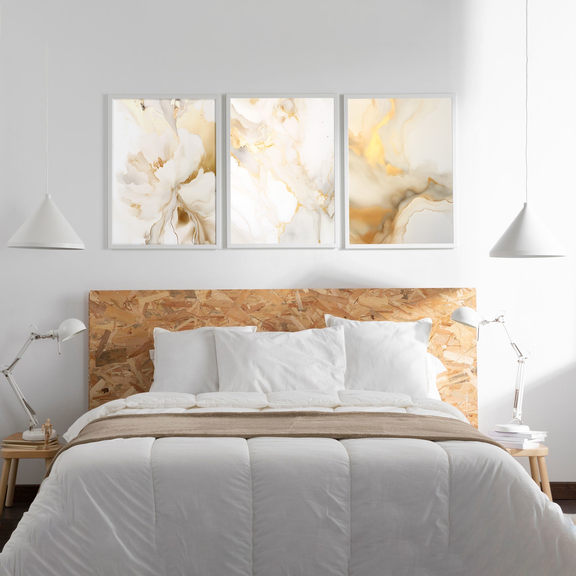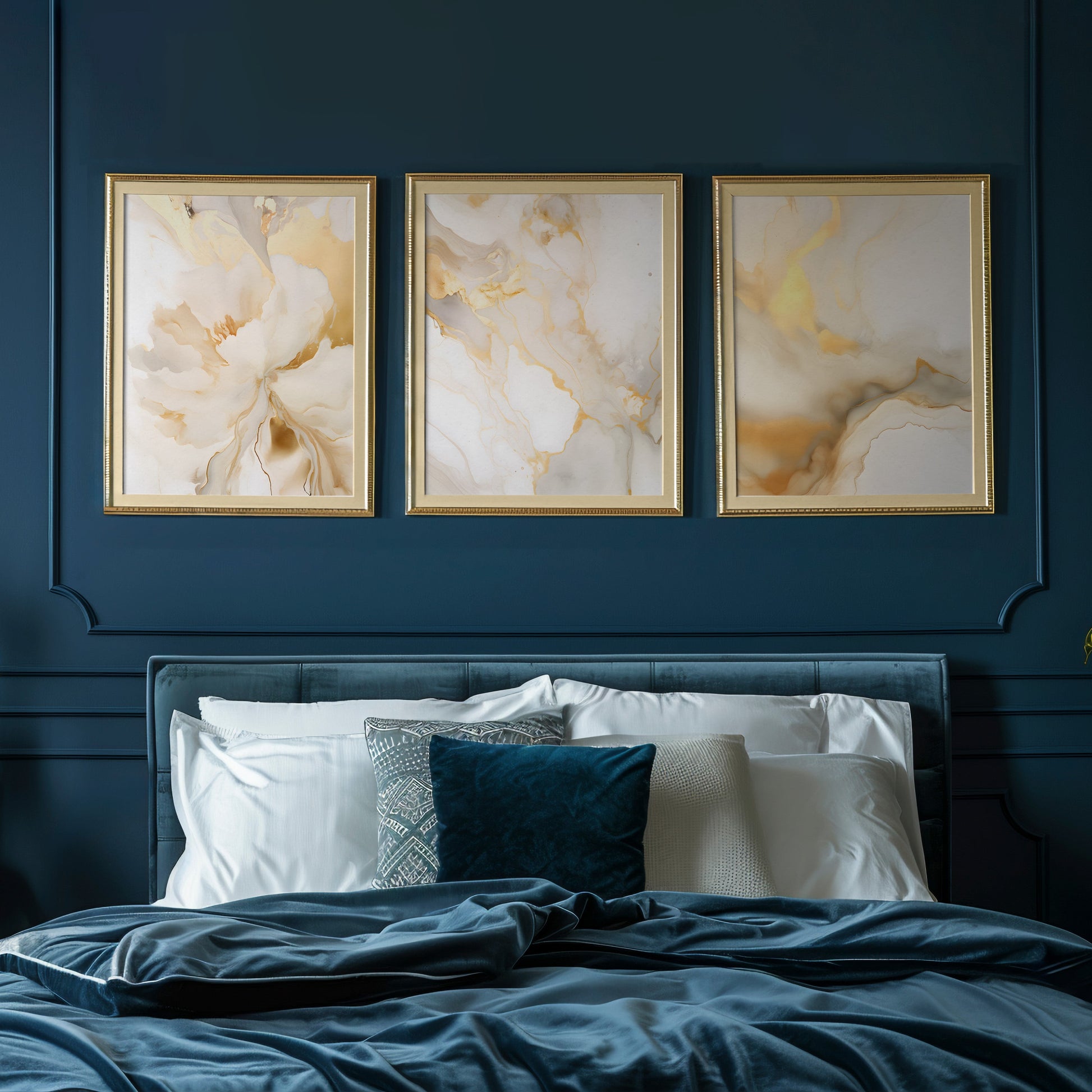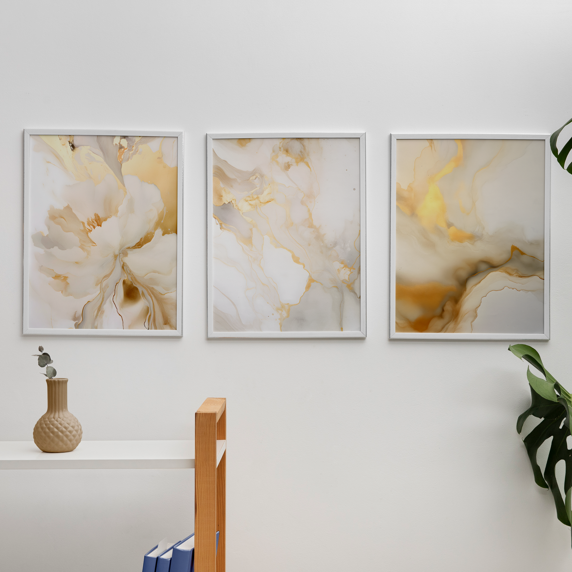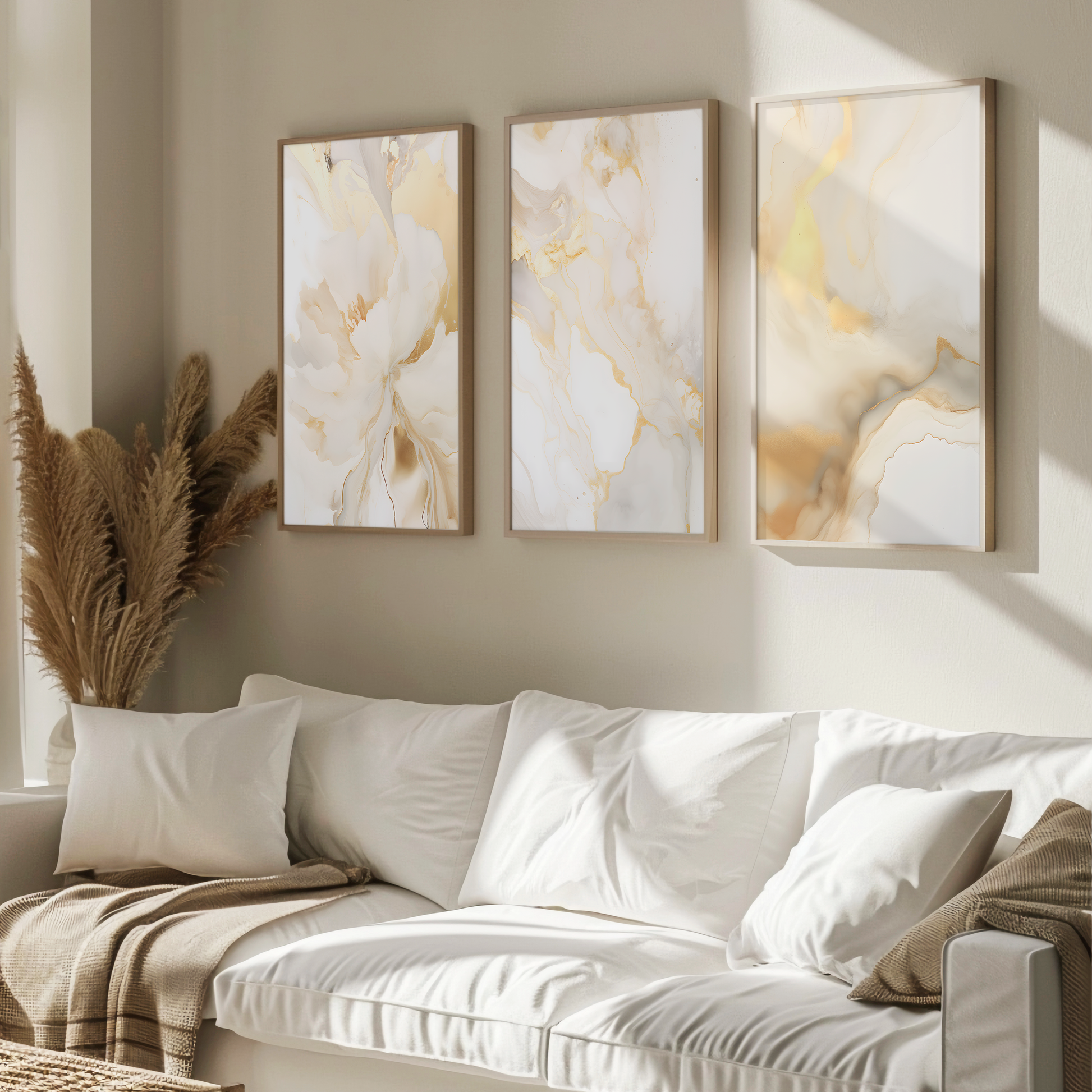 Golden Veil is a refined 3-panel abstract artwork featuring soft ivory and cream tones flowing with delicate streaks of metallic gold. Each piece captures graceful movement and warmth, creating a serene yet luxurious focal point. Perfect for modern, minimalist, or elegant interiors, this set brings a touch of calm sophistication to any space.