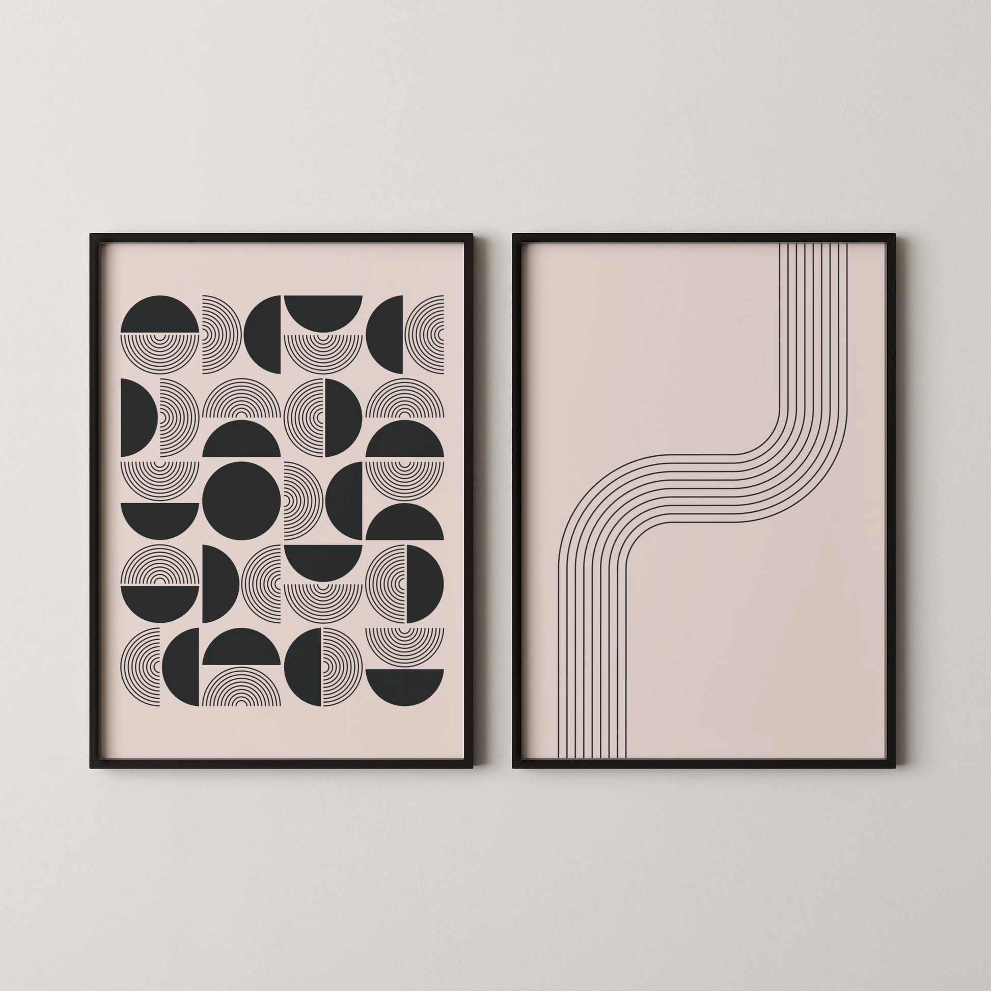 Modern Abstract Lines, Set of 2, Black & White Mid Century Aesthetic Wall Art