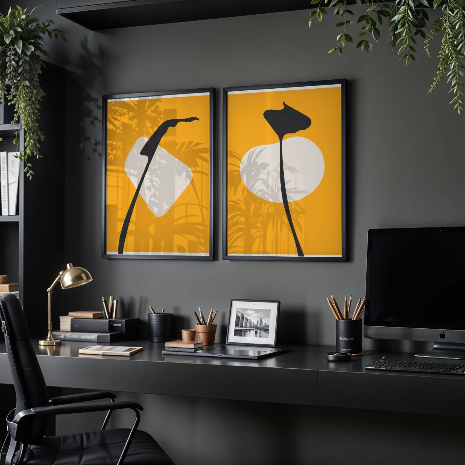 Modern Boheme Leaves, Bold Yellow, Set of 2, Mid Century Aesthetic Wall Art