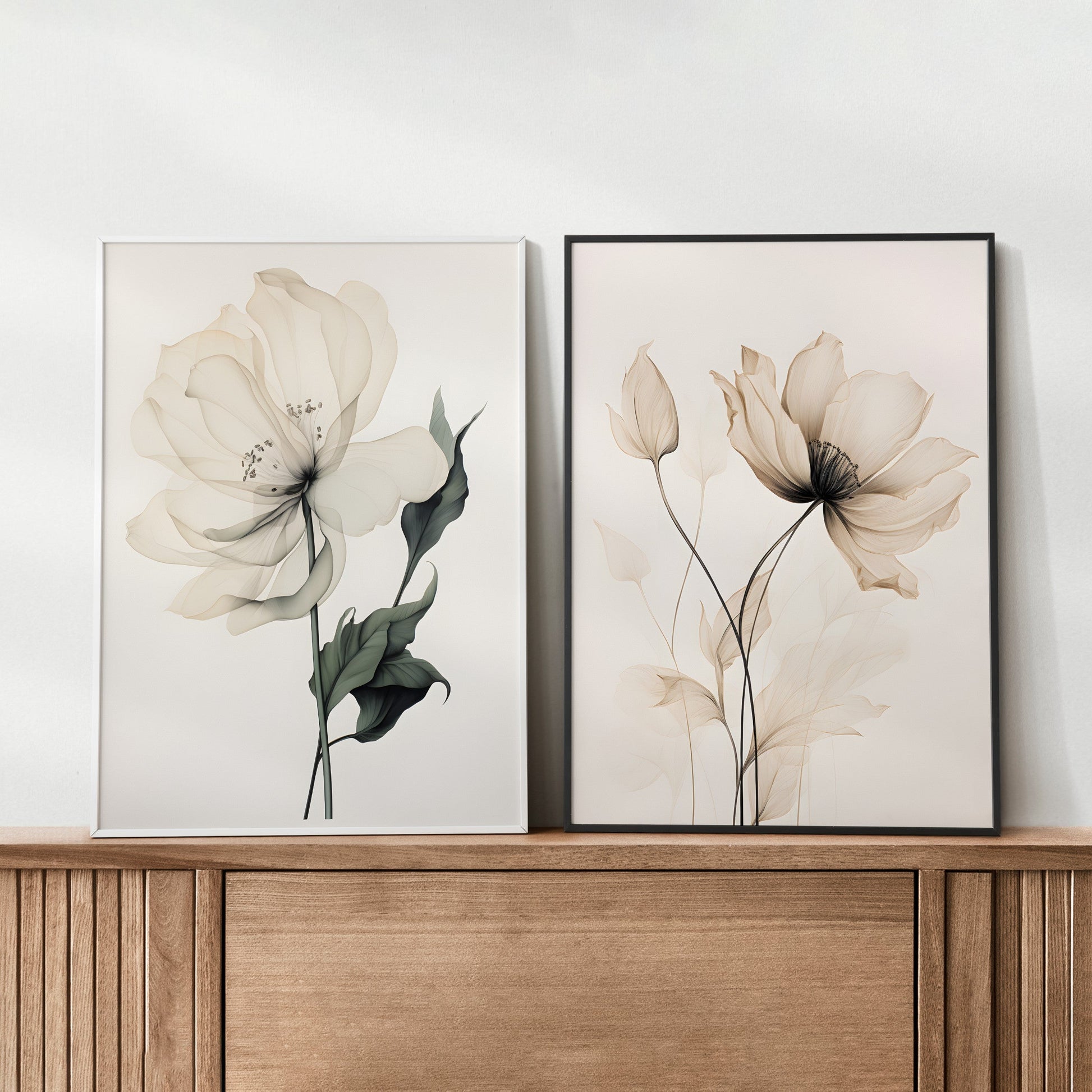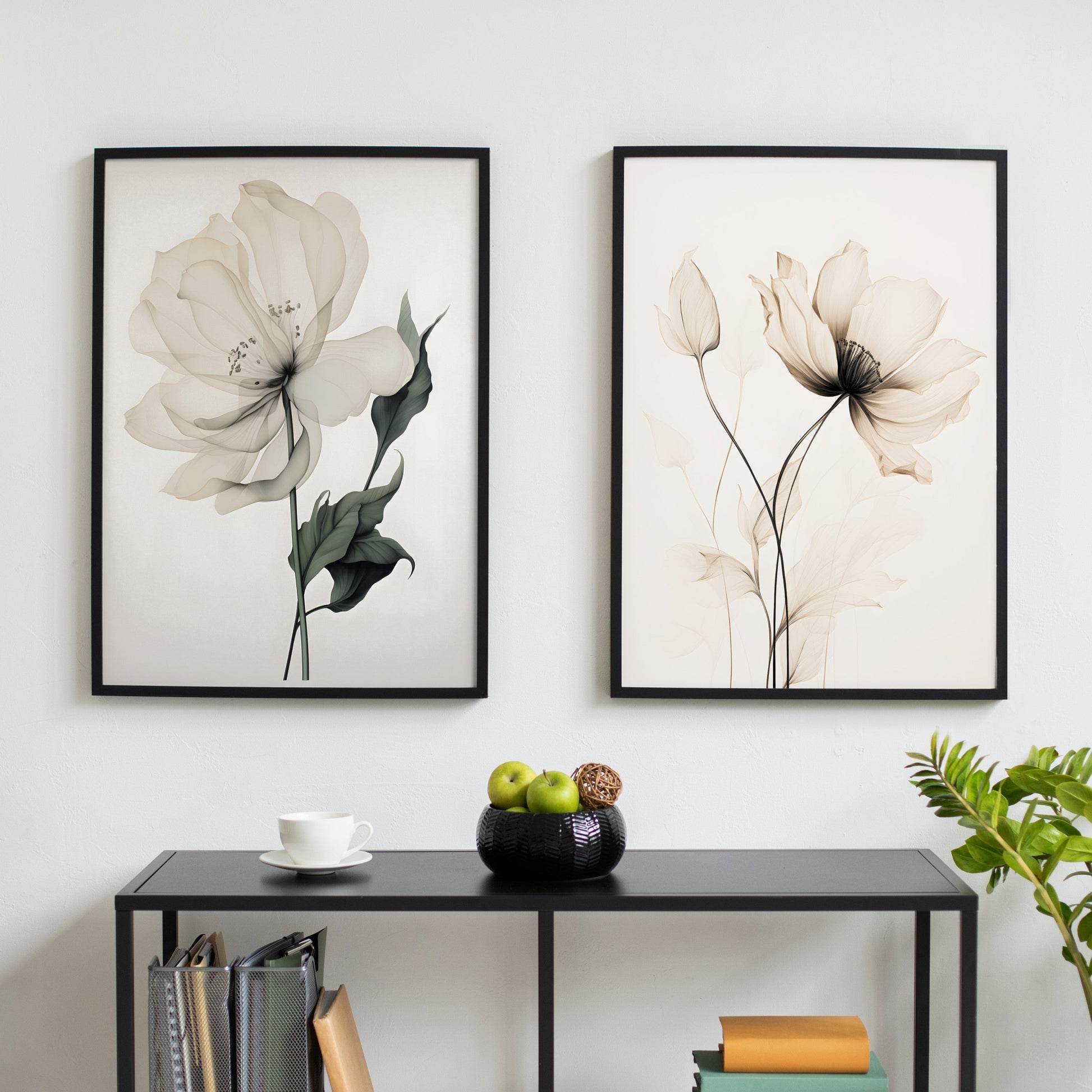 Delicate, ethereal, and profoundly graceful, Petal Reverie is a 2-panel botanical artwork that captures nature in its most poetic form. Featuring translucent petals in soft ivory and muted green undertones, each panel radiates an airy elegance that feels both modern and timeless. The intricate detailing of the florals creates a serene visual rhythm, making this set perfect for adding depth and calm to minimal interiors, reading corners, or bedrooms. A refined statement for lovers of subtle sophistication.